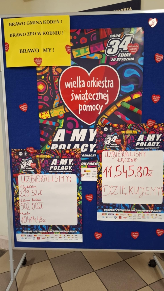 Serdecznie dziękujemy wszystkim, którzy wsparli tegoroczny finał Wielkiej Orkiestry Świątecznej Pomocy – wolontariuszom, uczniom, nauczycielom, rodzicom oraz mieszkańcom gminy Kodeń. Wasza hojność, zaangażowanie i chęć niesienia pomocy sprawiły, że mogliśmy wspólnie przyczynić się do tak ważnej inicjatywy.