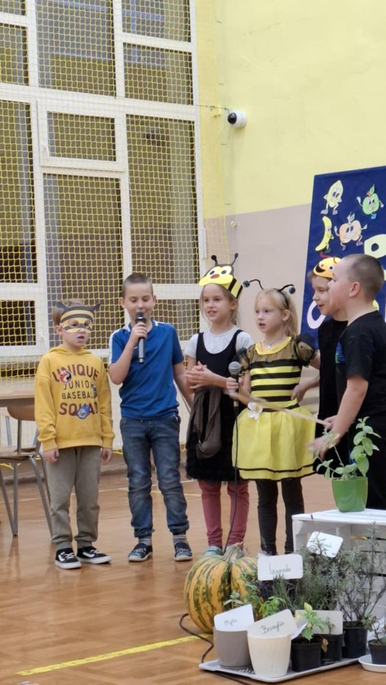 Podczas finału akcji uczniowie kl.1b zaprezentowali krótką inscenizację,,Na straganie”, przypominając wszystkim, że zdrowe jedzenie może być kolorowe, wesołe i pełne życia. Zaśpiewali też, ,,Ulową piosenkę”- o pszczołach, o ich pracy, o tym, jak powstaje miód- ,,złoty skarb” prosto z pasieki.