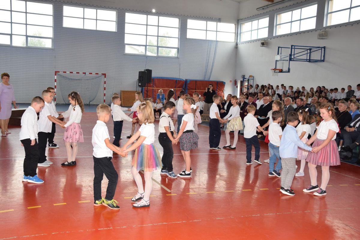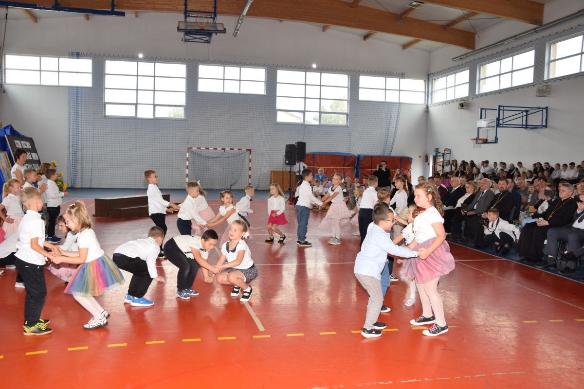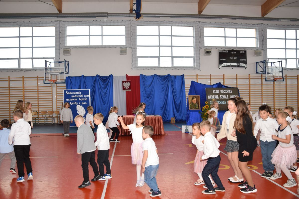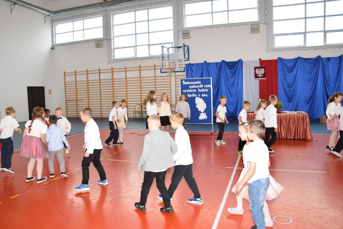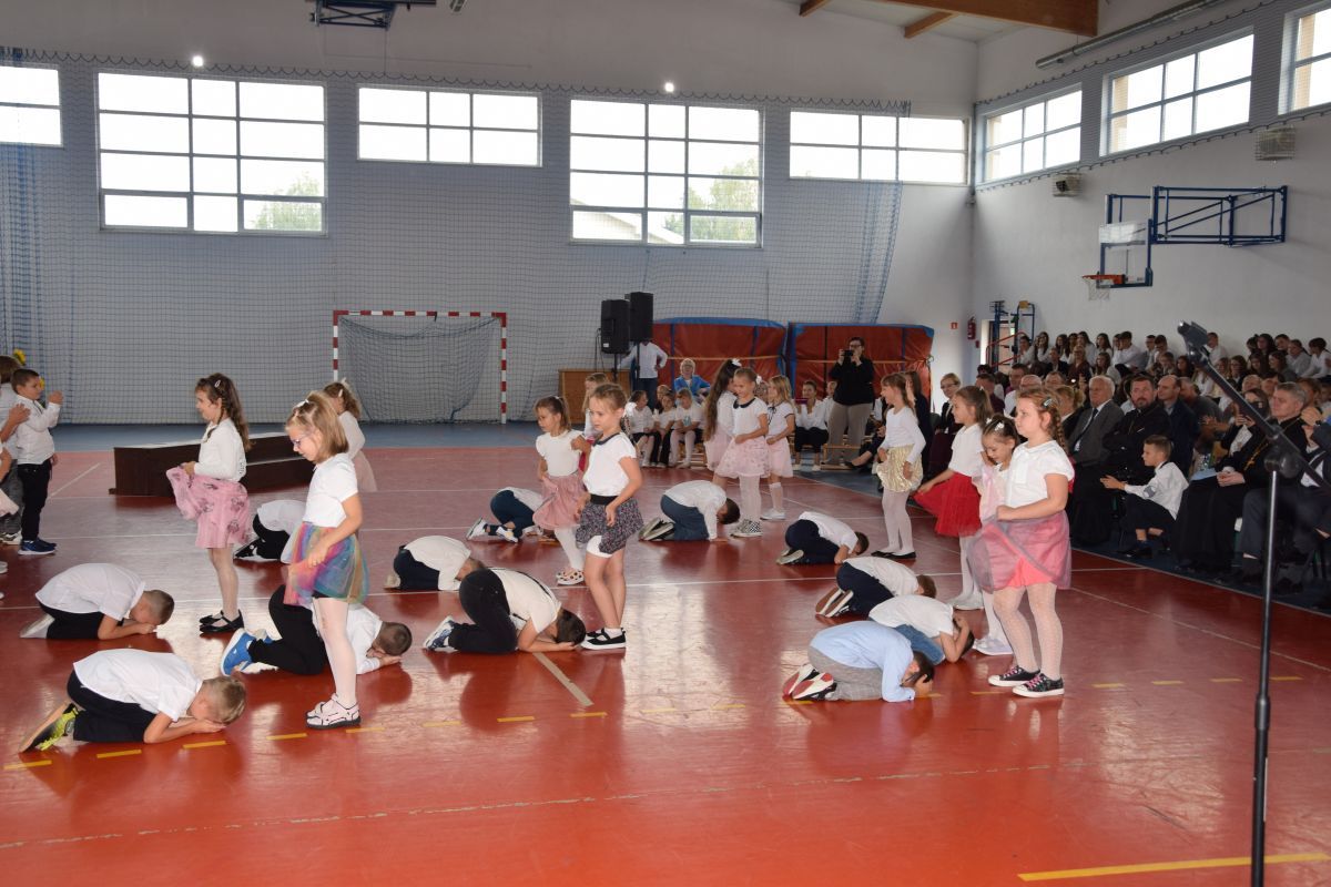 Kulminacyjnym punktem uroczystości było ślubowanie uczniów klas pierwszych, którzy przyrzekali rzetelnie wypełniać obowiązki szkolne, szanować tradycje i być wzorowymi kolegami. W dalszej części najmłodsi zaprezentowali program artystyczny, a następnie przygotowali dla wszystkich występ-niespodziankę – radosne tańce: belgijkę i twist, które spotkały się z entuzjastycznym przyjęciem publiczności.