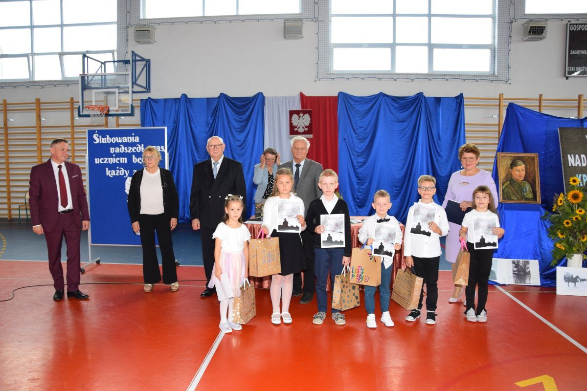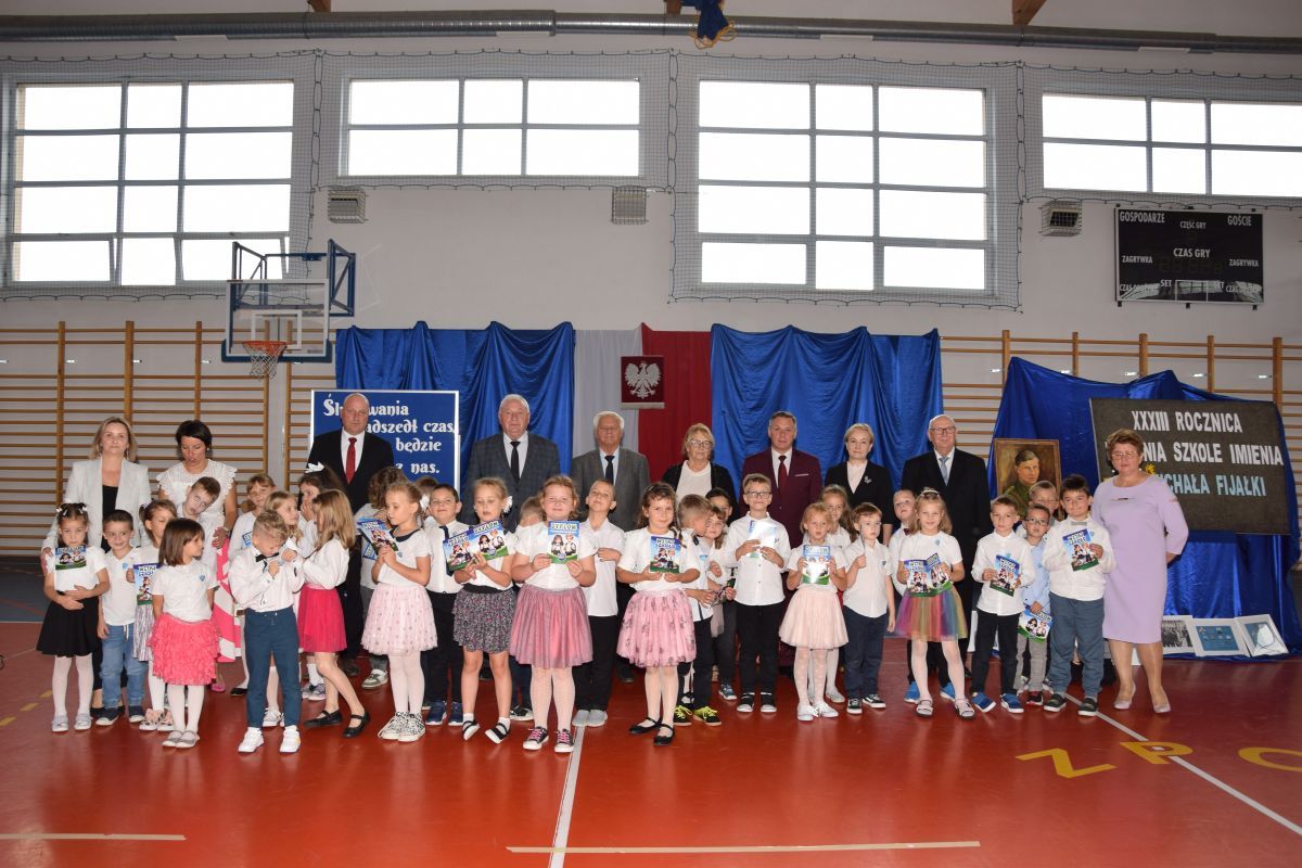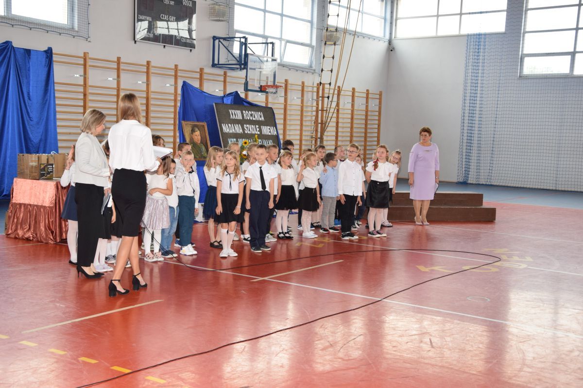 Następnie pierwszoklasiści otrzymali z rąk dyrektora szkoły, pana wójta, pani wizytator oraz rodziny patrona pamiątkowe dyplomy oraz tarcze. Był to symboliczny gest, podkreślający znaczenie tego dnia w ich szkolnym życiu.