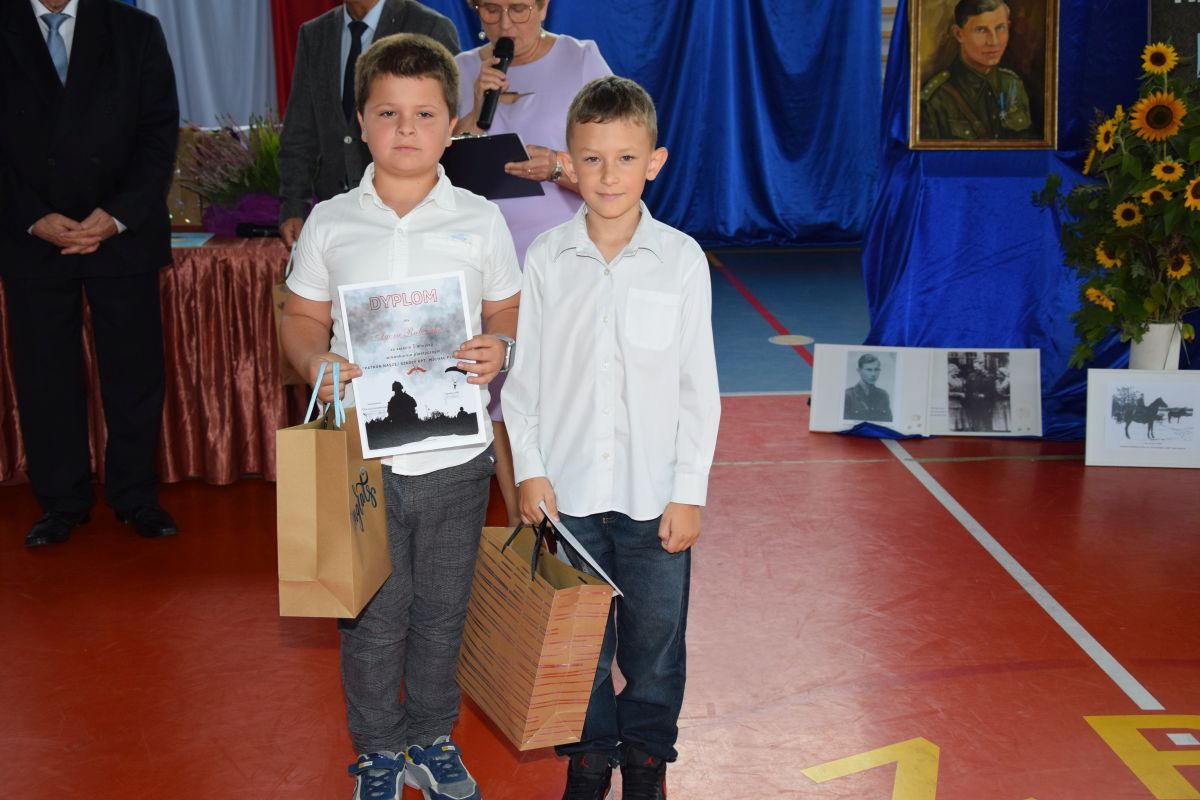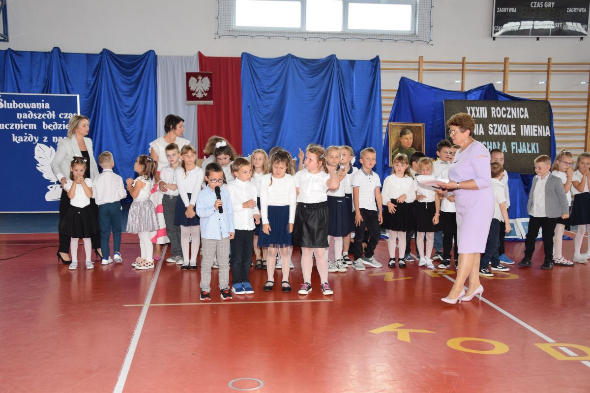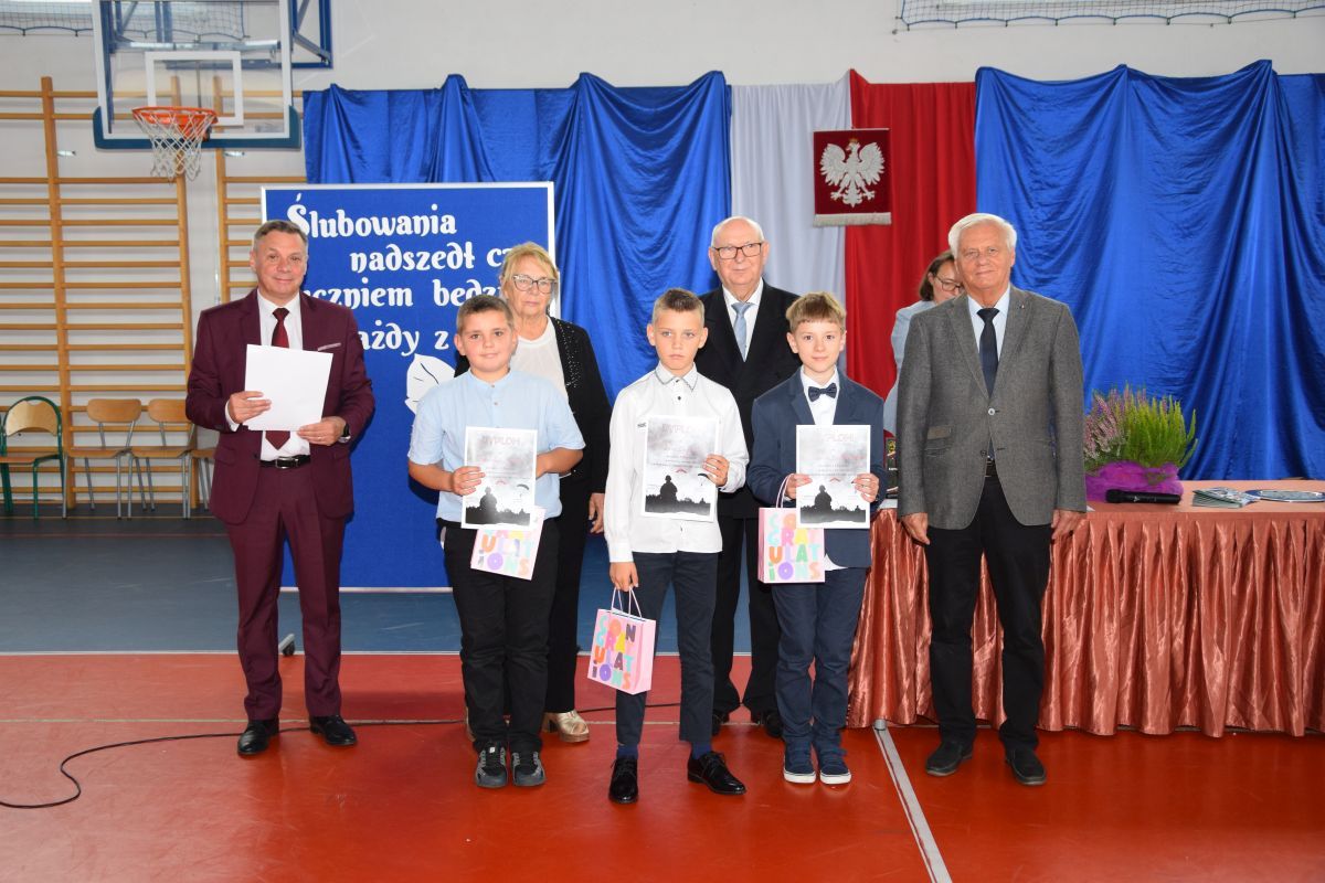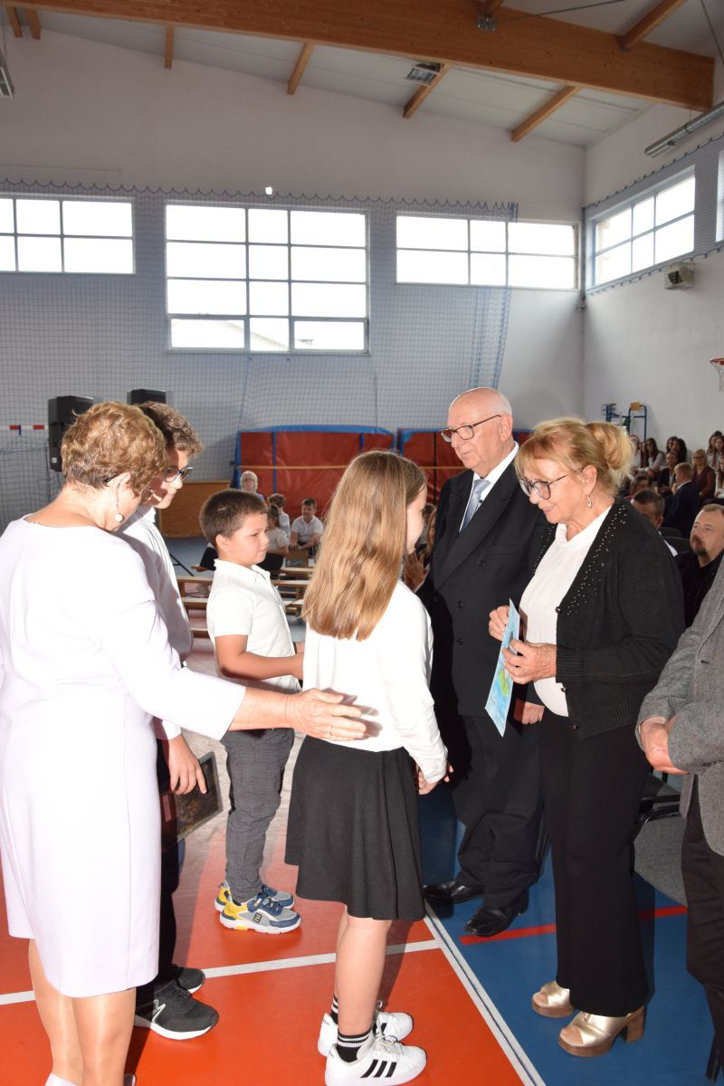 Następnie pierwszoklasiści otrzymali z rąk dyrektora szkoły, pana wójta, pani wizytator oraz rodziny patrona pamiątkowe dyplomy oraz tarcze. Był to symboliczny gest, podkreślający znaczenie tego dnia w ich szkolnym życiu.